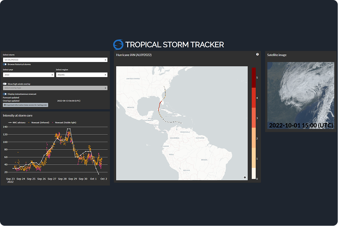 Provides the wind speed and precise location of tropical cyclones anywhere on the globe in real-time. It uses visible and infrared satellite images and a convolutional neural network solution.
